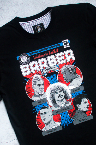 Top quality T-Shirt designed and sewn entirely in Europe. The Football Barbershop model is dedicated to those who remember the crazy years of the turn of the century, where the footballers' hairstyle was followed by skills. Today, this madness on the pitch is no longer there, but we resemble these characteristic players: Ronaldo (you know which one), Sagna, Xavier, Baggio and the fantastic Valderrama. The product includes: