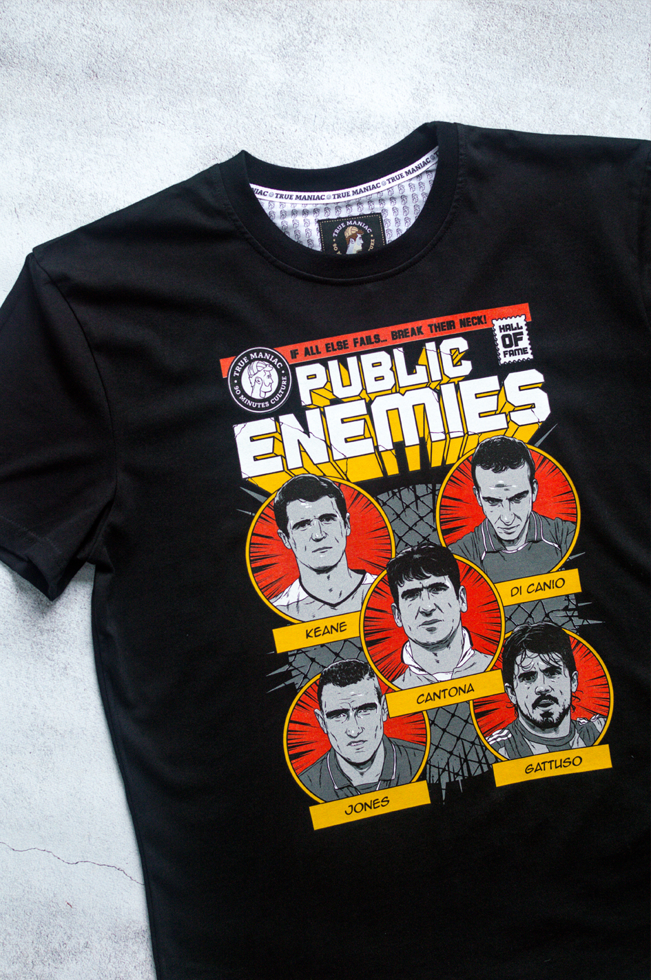 Najwyższej jakości T-Shirt zaprojektowany oraz uszyty w calości w Europie. Model Public Enemies dedykowany fanom piłkarzy nieprzebierających w środkach jeśli chodzi o rozwiązywanie sytuacji na boisku. Gatunek zagrożony wyginięciem. Piłka może zawsze przejść, ale przeciwnik nigdy. Cantona, Jones, Gattuso, Di Canio oraz Keane to ludzie którzy przyprawiali o bół głowy na boisku - często fizyczny. Produkt zawiera:
